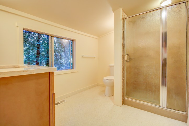 The open concept floor plan is presently styled as a spacious one bedroom home, (there used to be two bedrooms). There’s a bonus room, a large deck and a smaller brick patio, and a little-used walking trail up the hill.   Downstairs is a full height basement with washer/dryer: room for storage or a workshop.